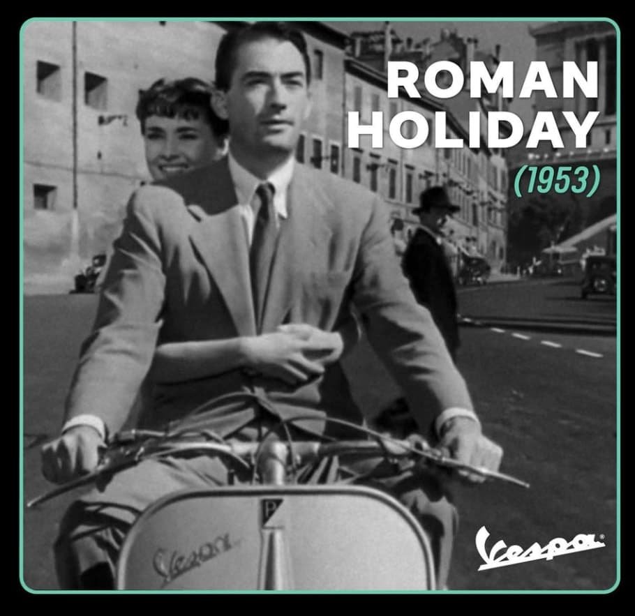 Vespa & cinema: um amor eterno. Com presença em mais de 1.400 filmes, a Vespa sempre teve uma relação especial com o cinema, que desempenhou um papel fundamental na popularização desta lendária marca. Sua primeira aparição nas telonas foi no filme italiano Domenica d’agosto, de 1950, mas a Vespa se tornaria um símbolo de status internacional em “A Princesa e o plebeu” (1953), de William Wyler, por meio da famosa cena com Audrey Hepburn e Gregory Peck enfrentando o tráfego romano montado em uma Vespa 125.