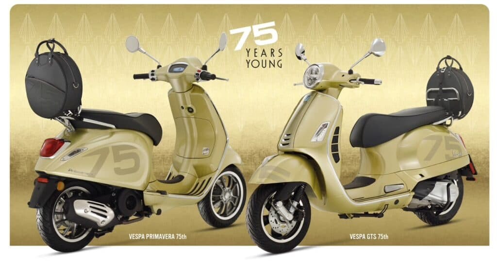 2021. Vespa atinge 19 milhões de unidades produzidas e comemora 75 anos com a 75ª série especial Vespa que veste as famílias GTS e Primavera com uma nova elegância.